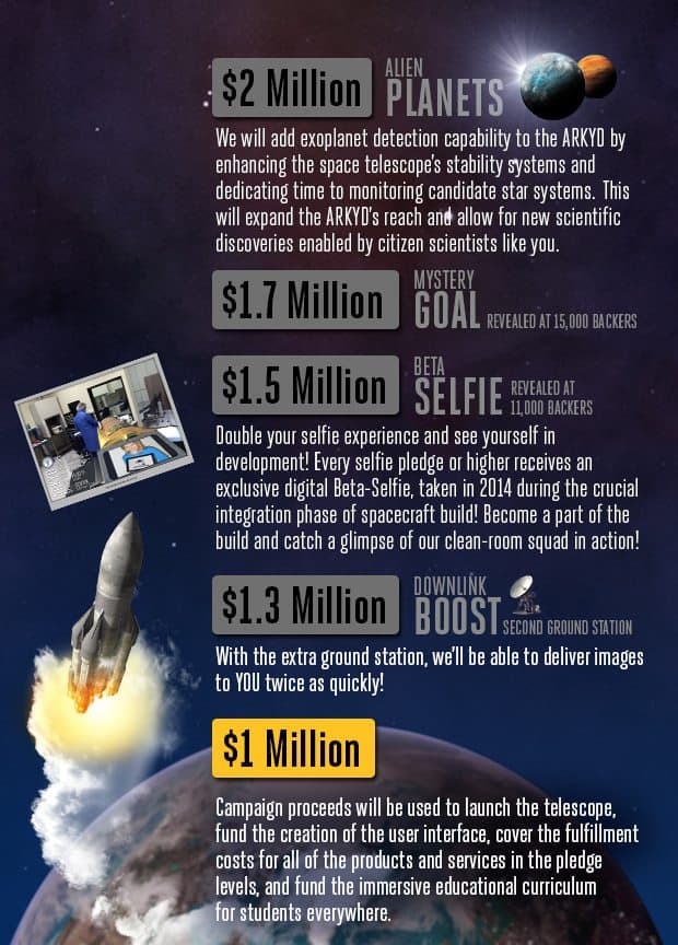 The ARKYD space telescope has surpassed their initial goal of $1,000,000 crowdfunded on Kickstarter. This occurred after the organizers had announced stretch goals with a final target of $2,000,000 raised. The crowdfunding campaign still has 9 days left to go so raising another $1 Million, while a challenging task, is still doable.