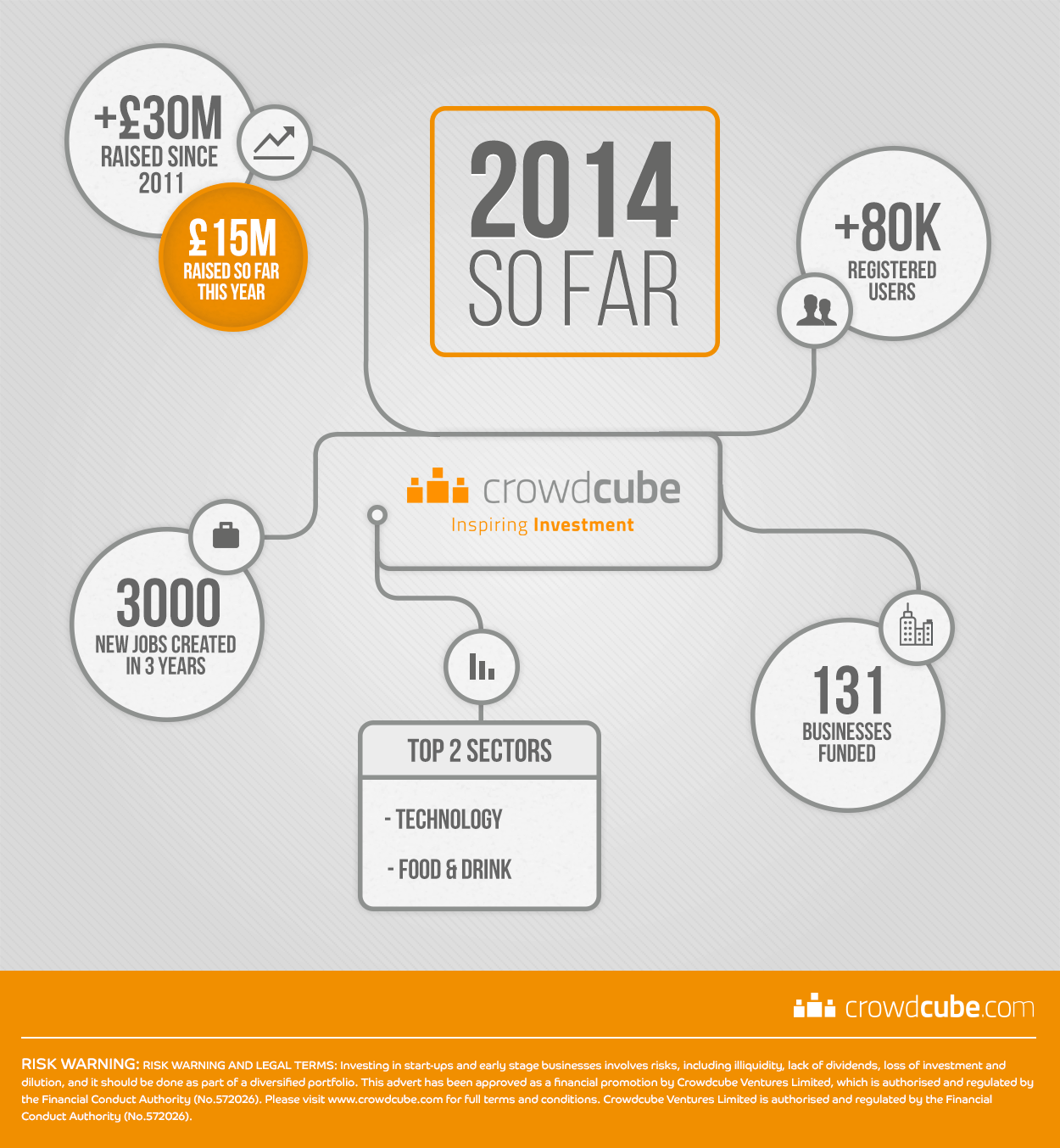 UK based investment crowdfunding platform Crowdcube has released some half year numbers regarding their progress. The young company shares they have raised £15 million for all of 2014. That makes approximately £30 million since the site launched in 2011. Some other data points include: