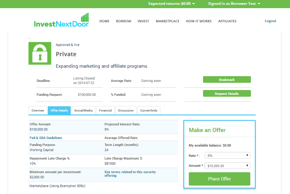 On the new platform small businesses create listings including how much they want to borrow and investors bid auction-style on the rate and amount they’re willing to invest. This keeps costs low, maintains fairness and create autonomy in the marketplace. InvestNextDoor has transferred the services banks, direct lenders and VC’s use for underwriting and due diligence, directly to the hands of borrowers and investors.