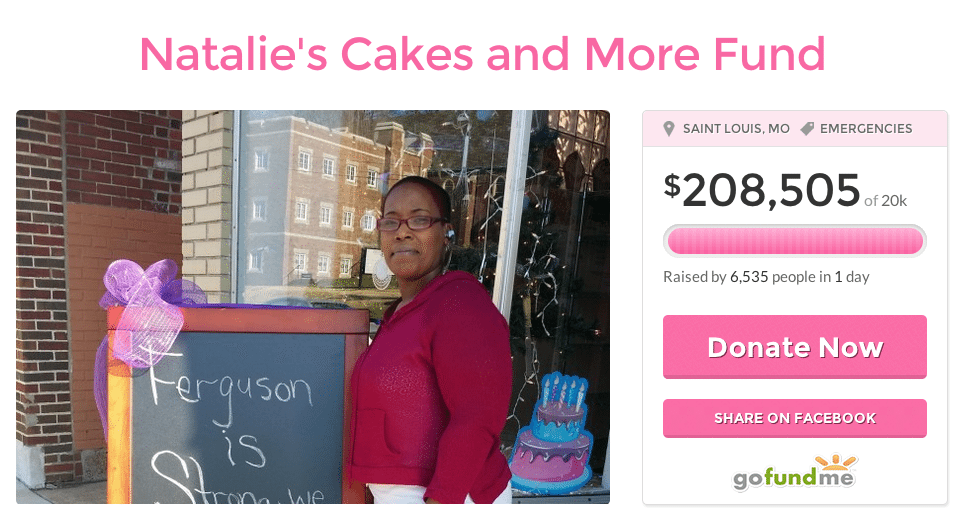 The events surrounding the shooting death in the small town of Ferguson, Missouri have certainly been tragic and unfortunate. But occasionally some events that inspire rise to the surface contrasting despair with hope. Natalie’s Cakes and More, operated by Natalie Dubose from Ferguson, saw here business damaged during the riots at the peak of her season. Collateral damage like this can be heartbreaking – especially for a small business owner and entrepreneur. But Natalie has benefited by the generosity of others having launched a crowdfunding campaign on GoFundMe hoping to raise $20,000 but doing ten times that – and more.