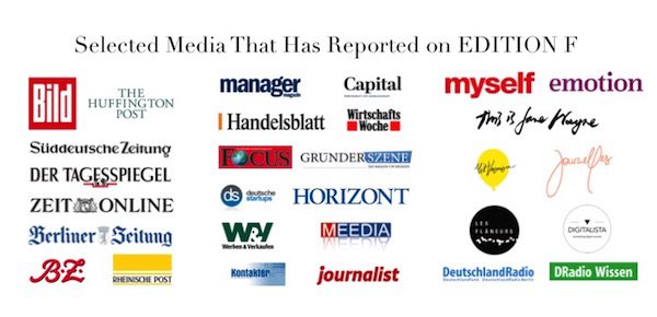 In addition to frequent international media coverage, EDITION F has been the recipient of several notable citations including largest independent silver media award, the Lead Award 2014, in the category “Online Independent of the Year,” “Promising Start-Ups: Look out for these 25 founders”, published by Wirtschaftswoche and Handelsblatt, and EDITION F Co-founder and editor-in-chief Wohlert was named one of the “Top 30 under 30 Journalists of the Year 2014” by Medium Magazin.
