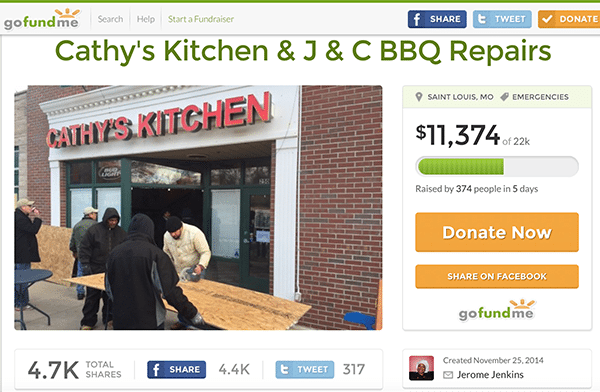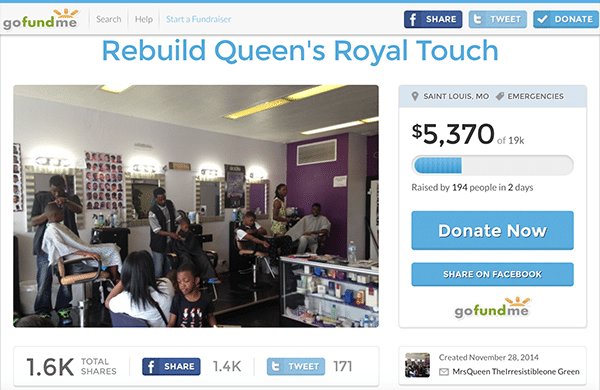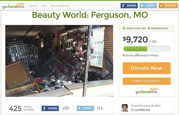 As the city of Ferguson continues to experience riots and devastation following the jury’s decision to not indict police officer Darren Wilson for the killing of teenager, Michael Brown, more and more business owners are launching crowdfunding campaigns on GoFundMe for receive more help in repair costs.