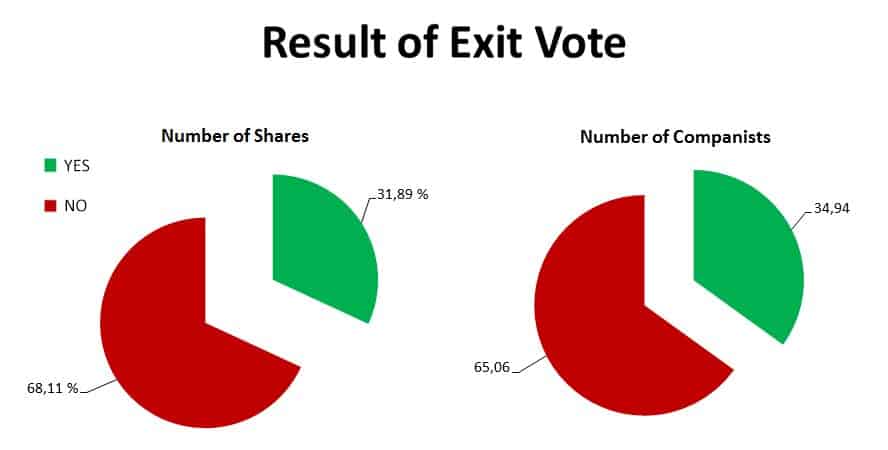 Of the participating shareholders who voted, 31.89% voted for the offer and 68.11% against. A super majority of 75% had to be cast in favor of the offer for it to close.