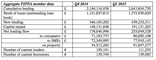 The Peer to Peer Finance Association (P2PFA) has announced Q1 data on P2P lending in the UK. Updated numbers indicate that over £459 million was originated in the first quarter bringing the cumulative lending amount to more than £2.6 billion.
