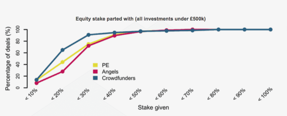 According to a report published by Beauhurst, companies that utilize equity crowdfunding end up selling a smaller stake in their company to shareholders. The document compared equity crowdfunding platforms in the UK to their counterpart Angel and VC groups. The difference between traditional finance and internet funding may be attributed to smaller companies now having better access to capital:
