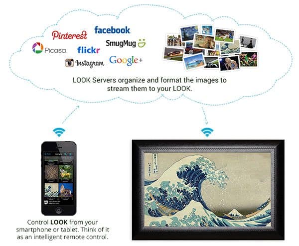 The LOOK supposedly builds on and improves the once-cumbersome digital photo frame with an easy-to-use, pixilation-free, large HD screen. It connects friends, family and interests by automatically displaying pictures from multiple sources, including photo sharing sites and social networks, all controlled through a set-it-and-forget-it simple app.