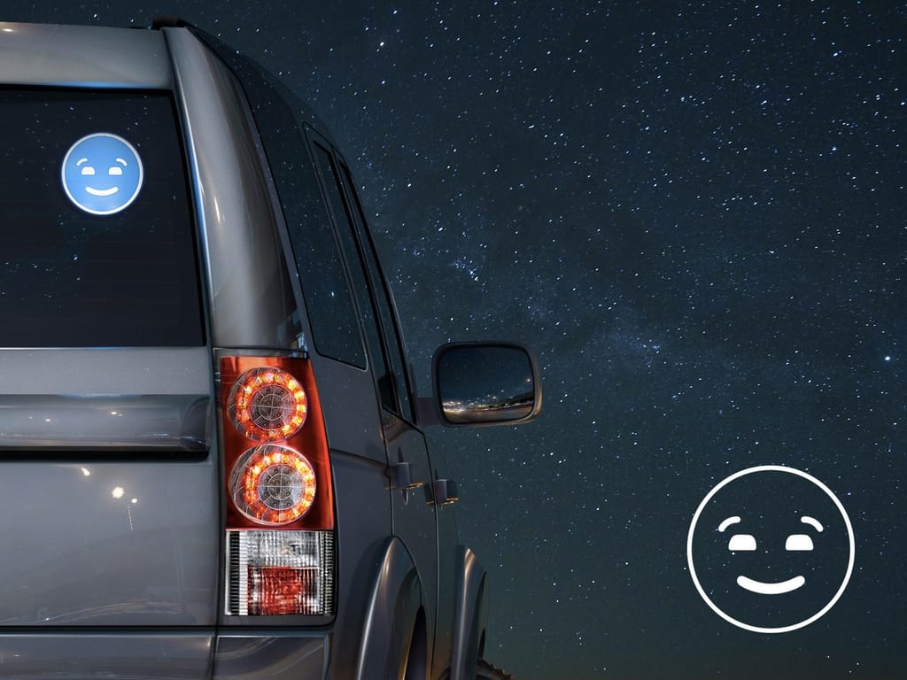 Here’s how it works: A single push of the remote button lights up the happy face for six seconds before it automatically turns off. The smiley face comes in three colors (blue, pink and green). The face simply attaches to the inside of your car’s rear window using removable adhesive clips.