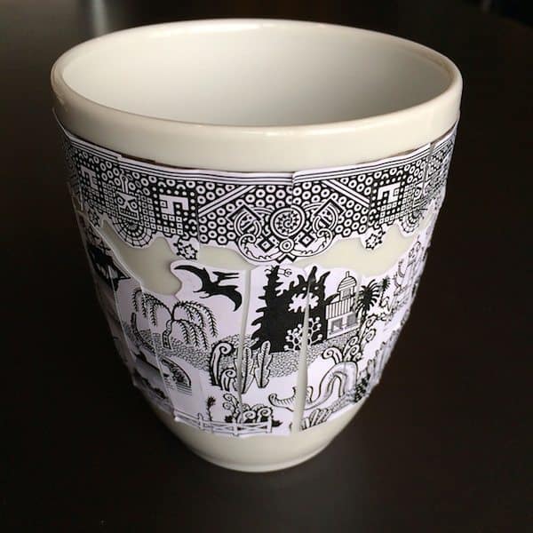 These porcelain mugs feature Moyer’s drawings of a traditional blue-willow paradise discombobulated by more than a dozen calamities, perils, and pests. These include a hairy fiend, giant frog, pirates, cephalopod, unpleasant blob creature, voracious sea monster, UFOs, aggressive pterodactyls ambunctious robot, zombie poodle, other suspicious animals and shrubs.