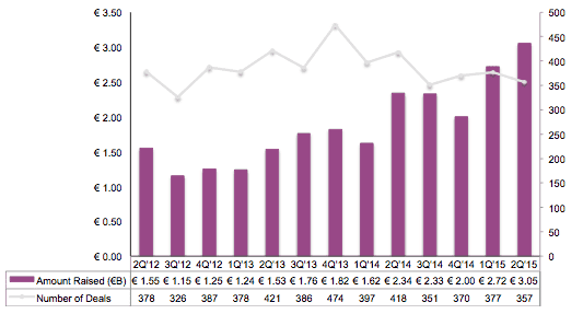 Overall European companies raised over €3 billion for 357 deals during the second quarter an increase of 12% but for fewer deals.