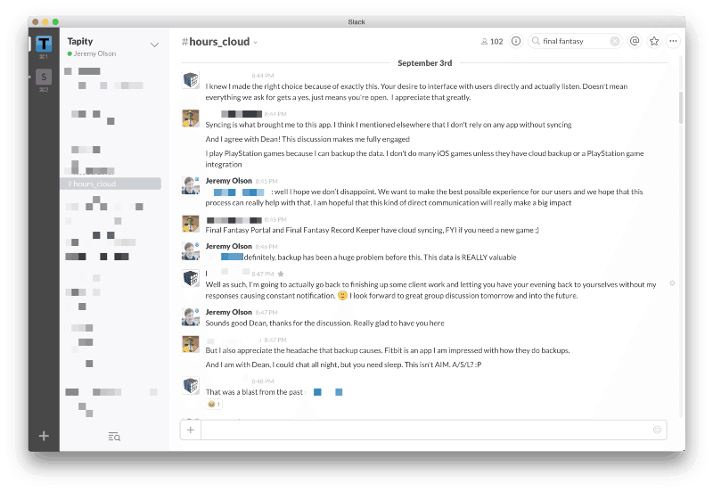 Having a group to quickly bounce ideas off in a casual way is going to be invaluable in improving Hours in the upcoming years. We stumbled upon it because of the crowdfunding campaign, but this is something we wish we had started a long time ago.
