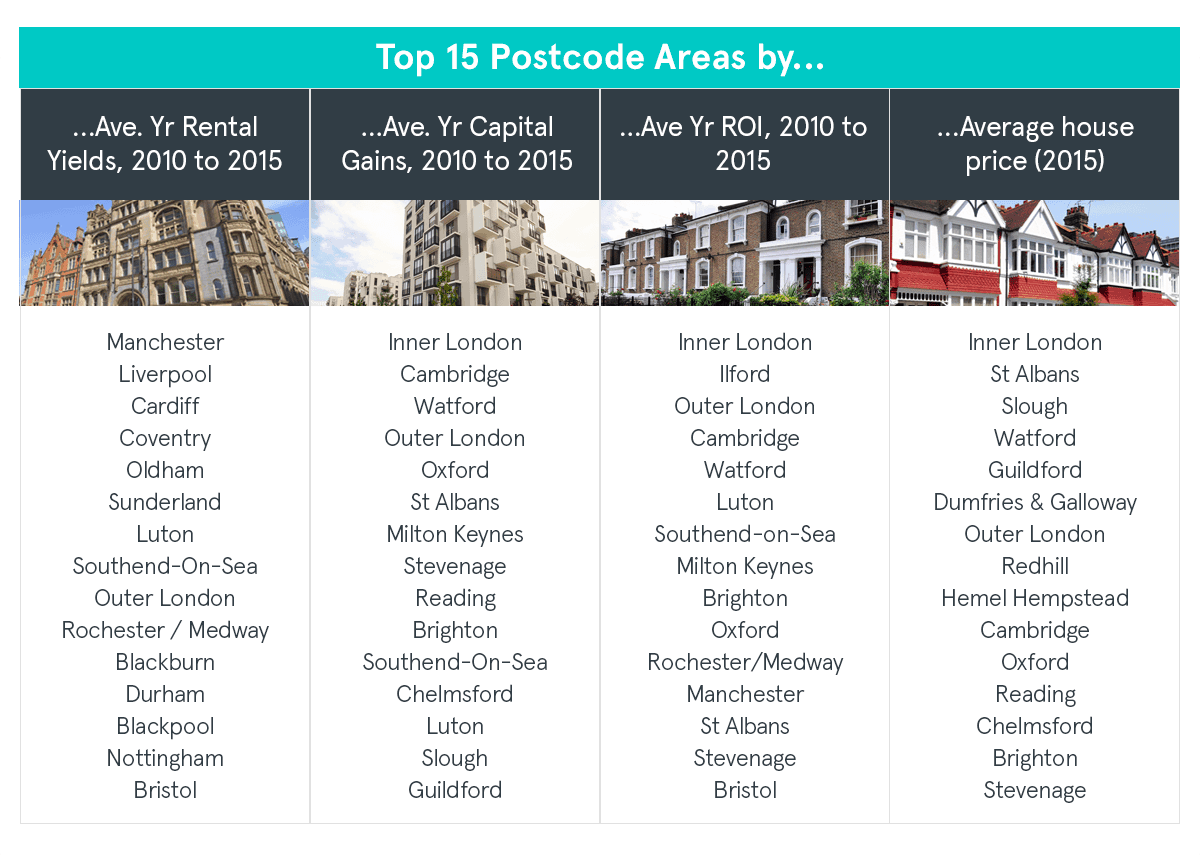 - Rental yields are no indication of average house price. Only 1 of the Top 15 postcode areas for rental yield also features in Top 15 for house price (i.e. Outer London)