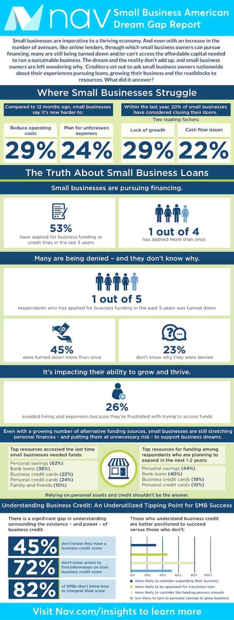 According to the Federal Reserve Bank of New York, up to 72 percent of small businesses get turned down for bank loans. However, Nav’s research shows small business owners who understand their business credit scores are 41 percent more likely to be approved when they apply for a business loan. Nav’s survey also showed nearly one quarter of business owners who were turned down for a loan didn’t know why they were denied, and nearly half of small businesses were unaware business credit scores even existed. See infographic below.