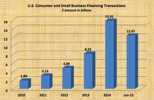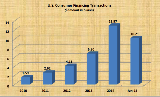 - From 2010 to 2014, the dollar amount of the companies’ consumer financing transactions grew nationally by 715.7 percent, from $1.59 billion to $12.97 billion.