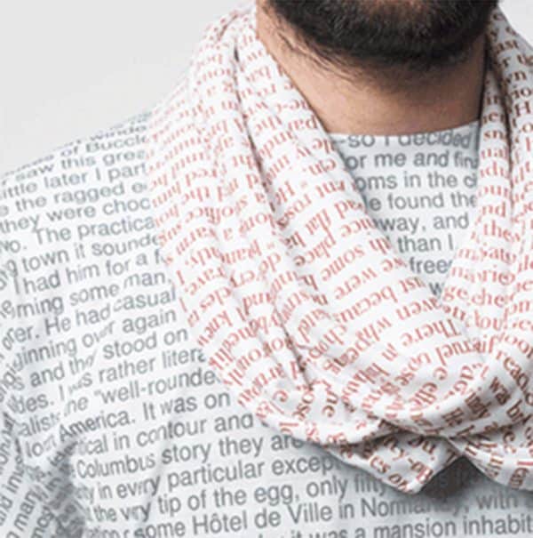 “To celebrate the launch of our scarves, for the first time ever, we’re producing entirely custom Litographs, exclusive to Kickstarter. We’ve always wanted to print your words, and now each and every backer will be able to wear their own unique text. Whether you would love to see your own writing in print (maybe you have a short story or write poetry), wear the words of a loved one or friend (perhaps your other half writes song lyrics), or pick any other piece of text in the public domain (a classic novel from before 1923, a famous historical speech, or even the first 40,000 digits of pi) – we will handcraft you a truly one-of-a-kind scarf or t-shirt. You can even customize the color, style and size of your text.”