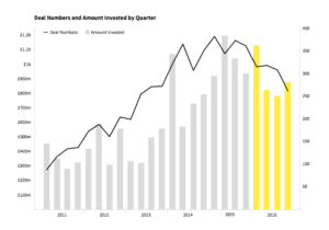 The most recent edition of the Deal, published by Beauhurst, includes some disappointing news. According to the UK research house, investment in UK startups has dropped by the largest amount in 5 years. Beauhurst reports that the number of deals declined by 18% during 2016. This is the first time that has occurred since Beauhurst started tracking the sector. Until 2016, equity investment had increased every year since 2011.