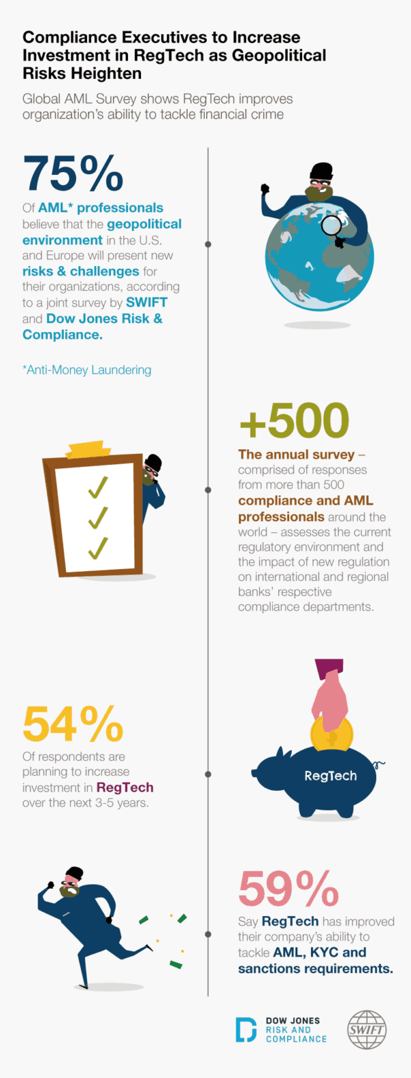 A large majority (75%) of anti-money laundering (AML) professionals believe the current geopolitical landscape presents new risks and challenges for preventing financial crime at their organisations, according to a joint survey by SWIFT and Dow Jones Risk & Compliance. To address these risks, more than half (54%) of respondents are planning to increase their investment in RegTech in the next three to five years, as the majority (59%) say technology has improved their company’s ability to tackle AML, KYC and sanctions requirements.