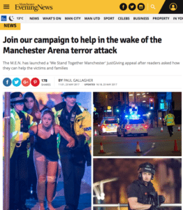 The Manchester Evening News, a daily circulation publication with circulation of 52,000, has launched a donations campaign on JustGiving to raise £2 million to support the families of the victims killed and wounded in the tragic Manchester Arena attack. The campaign, operated in partnership with the British Red Cross, has now raised over £1.2 million in just 2 days from more than 40,000 supporters. JustGiving will not be taking any fees on this campaign.