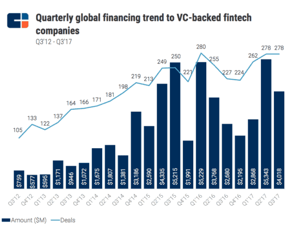 CBInsights has published their Q3 report on the global Fintech sector. According to their research, VC backed Fintech firms raised $4 billion into 278 deals during the quarter. While the number of deals held steady, the funding amount dipped from Q2 2017 which was a record quarter.