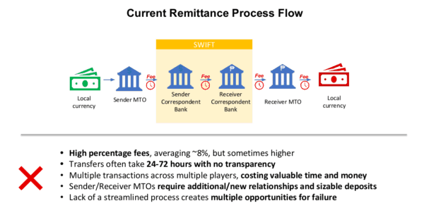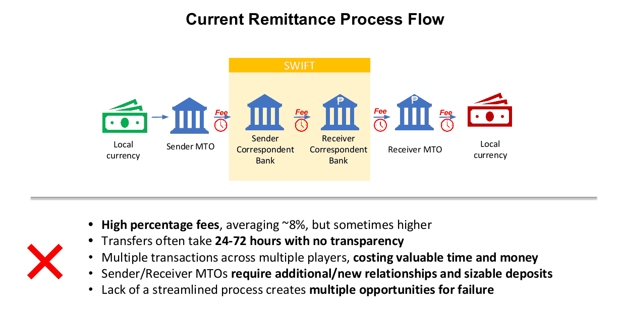 “Western Union and the three other largest money transfer operators (MTOs) account for approximately 25% of global remittance volumes. The remaining 75% is processed by thousands of small to mid-size MTOs which are hampered in their ability to scale owing to resource and latency constraints, illiquidity and a growing reluctance from banks to service smaller MTOs due to compliance overheads and moves to reduce the risk of their portfolios.”