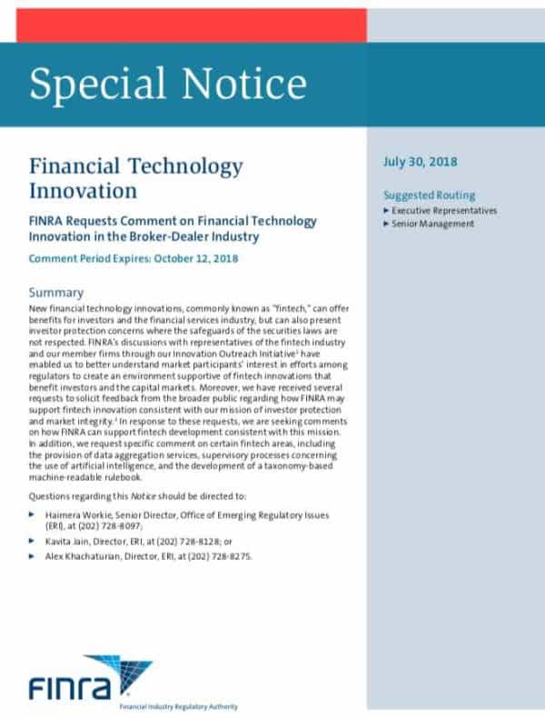 FINRA (Financial Industry Regulatory Authority) has issued a consultation on Financial Technology or Fintech and the Broker Dealer industry. The Special Notice was published at the end of July and is seeking comments until October 12, 2018.