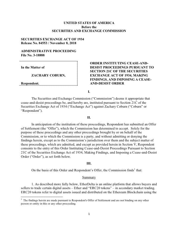 The Securities and Exchange Commission (SEC) has settled charges against Zachary Coburn, the founder of EtherDelta, a cryptocurrency exchange.