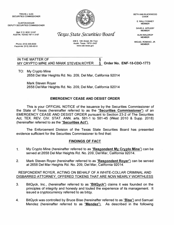 Since the failure of BitQy, Royer has now moved on to selling My Crypto Mine to Texas residents, the Texas Securities Board claims.