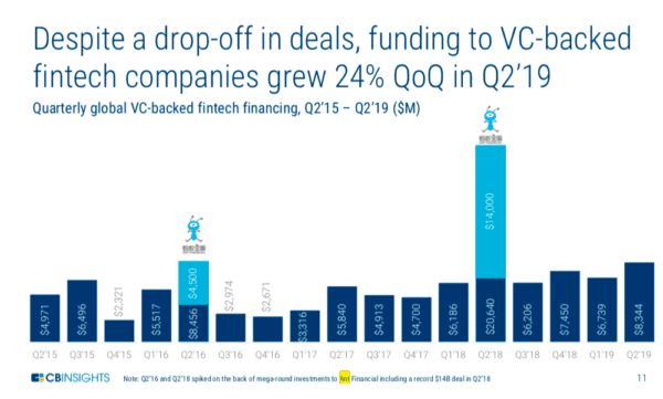 Global Fintech deals tallied 838 rounds worth $15.1 billion in the first six months of 2019 but the number VC backed Fintech deals dropped to the lowest number since Q4 of 2016, according to CBInsights quarterly Fintech report. While the number of deals may have declined the total funded in some regions moved higher. During 2018, there were some record-breaking funding rounds which skewed things a bit. Think Ant Financial’s record $14 billion deal in Q2 of 2018. Kind of hard to top that.