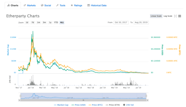 According to data from CoinMarketCap, FUEL (Etherparty) tokens debuted on crypto trading platforms at around $0.03 USD in the fall of 2017, and achieved a peak price of more than $0.04 USD in January 2018 before crashing precipitously in following months.