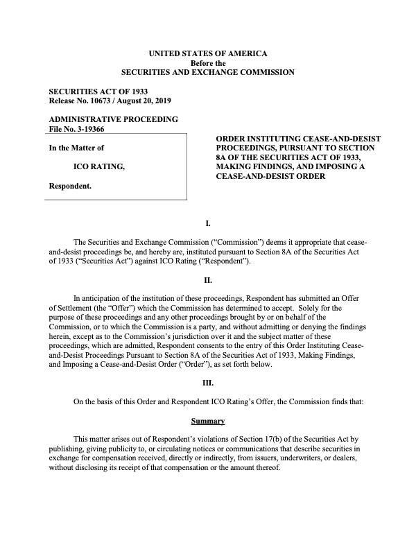 The SEC’s order finds that ICO Rating violated the anti-touting provisions of Section 17(b) of the Securities Act of 1933.