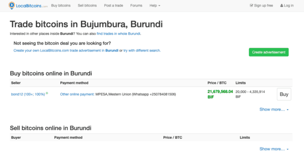 The site Localbitcoins.com, which coordinates independent cryptocurrency buyers and sellers, currently lists one individual selling bitcoin online in Bujumbura, Burundi’s former capital city.