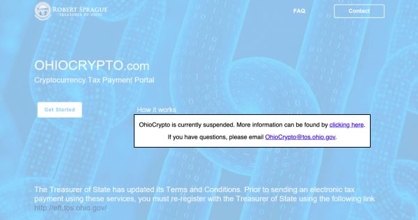 Robert Sprague, appointed as Ohio’s new Treasurer in January, has announced the suspension of OhioCrypto.com, the state’s cryptocurrency tax payments portal.