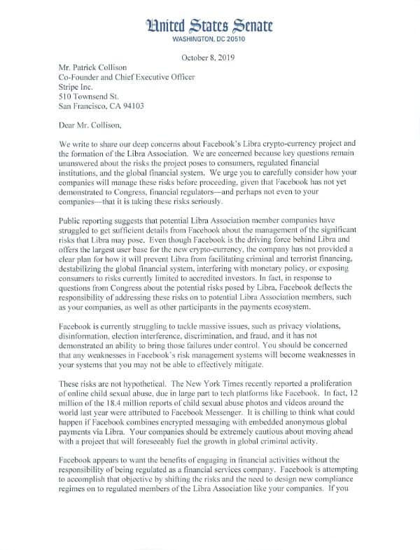 The senators end their letter to stripe with an unmitigated warning of action if the risks of Libra are not meaningfully addressed: