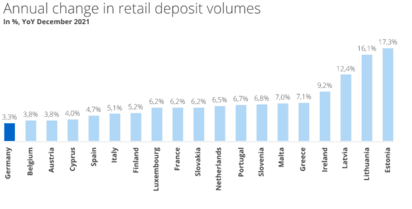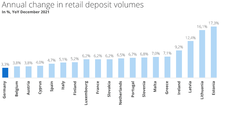 “European savers began ramping up their bank balances at the start of the pandemic and continued to save at record rates well into the first half of 2021. Since then, however, deposit inflows in Europe have fallen off a cliff. Nowhere has this been felt more than in Germany, where annual inflows fell below the 100-billion-euro mark for the first time since 2017,” added Lüth.