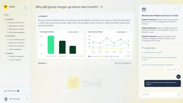 “What we do at Twill is combine those things,” Wright explained. “We allow SMBs to connect QuickBooks, Shopify, their POS system, marketing spend…We bring that data in, and we have a conversational, generative interface that allows them to interact with their data.”