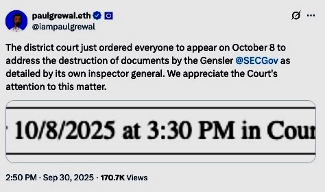 Although there is no comment on intentional activity, it appears that Coinbase, once the target of an SEC enforcement action, is not entirely convinced. In a post on X, Coinbase Chief Legal Officer Paul Grewal states that a court hearing is scheduled to take place next week to “address the destruction of documents by the Gensler.”